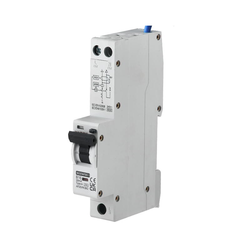 Arc-fault detection devices(Fire protection switch, AFDD) are designed to protect serial and parallel fault arcs in accordance with EN62606(DIN VDE 0100-420).They are commonly referred to as fire protection switches. They must be installed in permanently installed final circuits up to 40A. for example. facilities at risk of fire or public institutions.They are also recommended for bedrooms and for final circuits with high connection loads.The devices detect highfrequency arc faults, such as those occurring as a result of cabling defects. The early recognition and switching off of the final circuit. which may occur as a result in the case of an emergency. prevent thermal effects of arc faults The risk of fire resulting from incorrect electrical installation is significantly reduced.The reason for tripping is indicated by an LED colour code on the front of the device. BESTAFDD 1 are compact combination devices with a triple function: arc fault detection, line protection and residual current trip.They protect systems in the event of a short-circuit and overload as per the requirements of VDE o1o Part 430, and protect persons,farm animals and material items in the event of earth leakage currents as per VDE 0100 Part 410.The RCBO component works dependent of the mains voltage.Residual current type A allows the detection of sinusoidal AC currents and pulsating DC residual currents. The contact position indicators and the display tripped by residual current provide a quick overview of the operating status of the device. The devices up to 40 A devices have a rated switching capacity of 6 kA.The line protection with characteristic B ensure standard protection for lighting and socket circuits. Devices in standard design are intended for monitoring circuits with a rated voltage of 230 V and a rated frequency of 50 Hz.