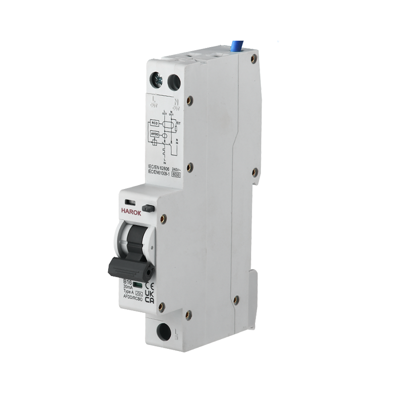 combination device with three functions, 1P+N(1Module), Variable neutral-pole position, AFDD as per IEC/EN-62606, RCBO as per IEC/ EN61009, continuous self-monitoring, mains- voltage-dependent tripping of the RCCB/MCB functions. Display AFDD reason for tripping. Contact position indicators, Residual current tripping indicator, compact design for all rated currents, high short-circuit resistance, strain-relief clamps with protection against wires being lodged behind them, tri-stable snap-in slider for easy mounting and removal.